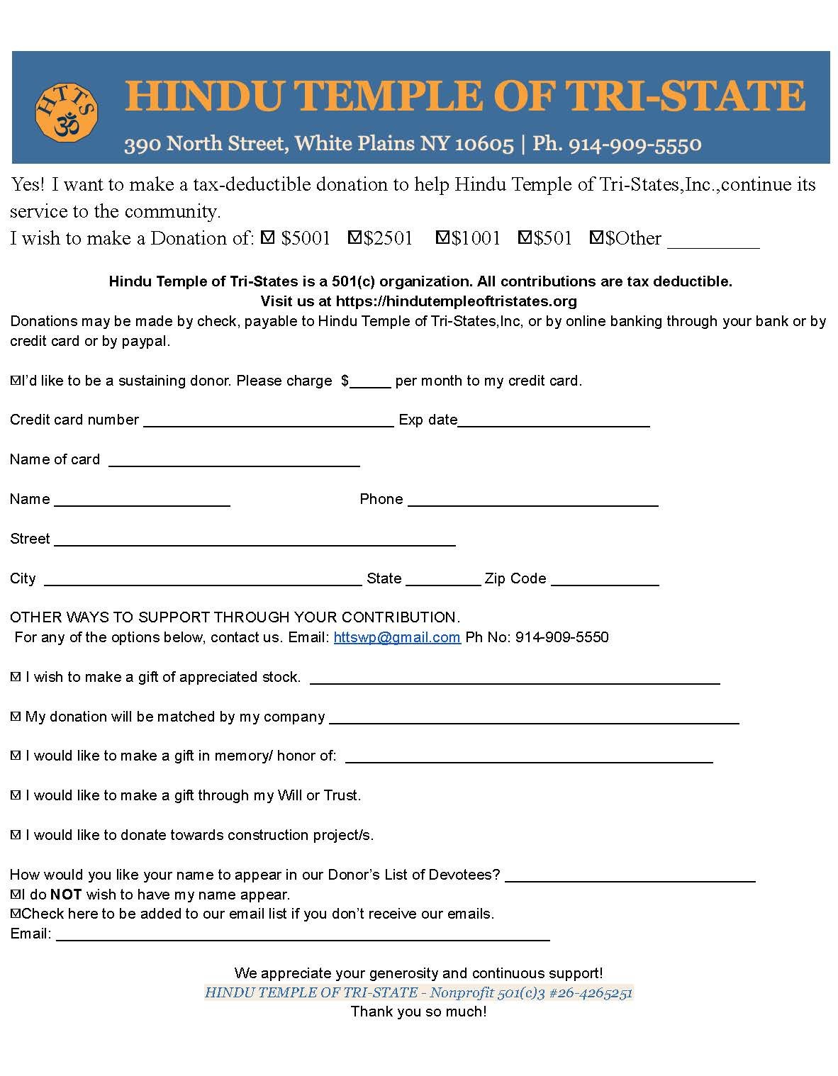 All donations are Tax Deductible. Temple nonprofit 501(c)3 # 26-4265251